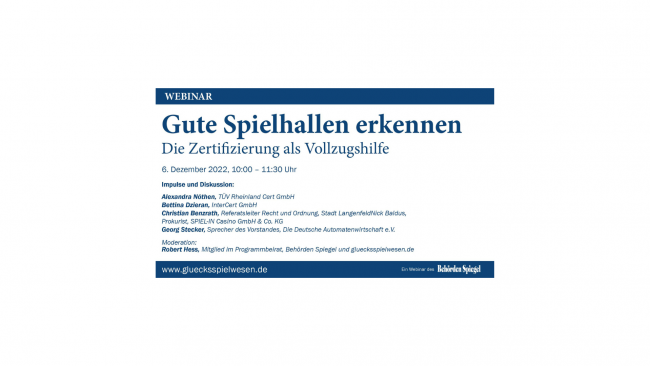Gesteigerte Prüfqualität stärkt den Verbraucherschutz und begrenzt den Schwarzmarkt Bonn (MFE). Ordnungs- und Vollzugsbehörden werden durch eine Zertifizierung entlastet. Experten erwarten eine bessere Begrenzung des wachsenden Schwarzmarktes. Zudem kann die Zertifizierung rechtliche Grundlage für Ausnahmeregelungen sein. Über 130 Einzelkriterien entscheiden über die Zertifizierung von Spielhallen. Diese finden sich an 18 unterschiedlichen Orten in der Spielhalle…