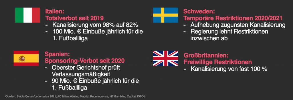 Beim Blick ins Ausland zeigt sich vor allem eines: Neben einem attraktiven legalen Markt ist Werbung für erlaubte Sportwetten einer der wichtigsten Faktoren für eine erfolgreiche Regulierung. Zu scharfe Restriktionen und Verbote hingegen schaden dem Sport und dienen nur dem Schwarzmarkt, was sich an mehreren Beispielen zeigt: