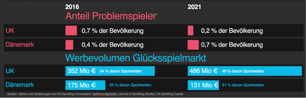 Entgegen den Behauptungen einzelner Akteure gibt es keine Korrelation zwischen dem Volumen von Glücksspielwerbung und Spielsucht. Dies zeigen insbesondere Länder wie Großbritannien und Dänemark, in denen anders als in Deutschland regelmäßig verlässliche Daten über den Glücksspielmarkt erhoben werden.