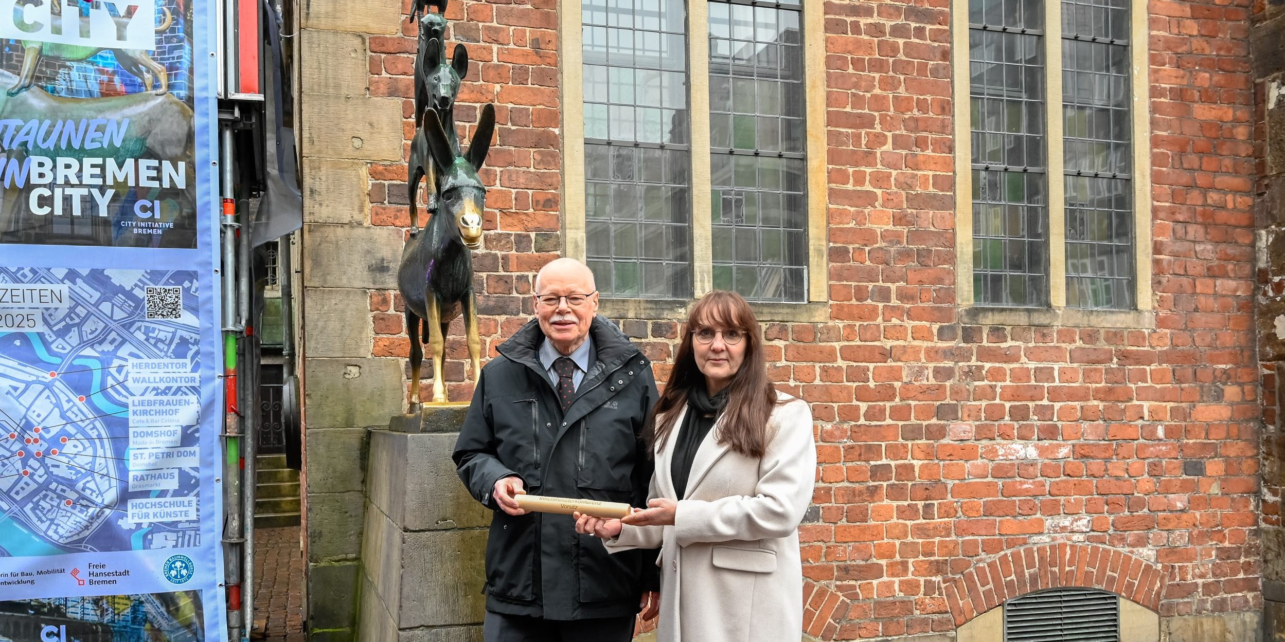 Der Vorsitz der Innenministerkonferenz (IMK) hat gewechselt: Bremens Innen- und Sportsenator Ulrich Mäurer hat den Staffelstab von seiner Amtskollegin Katrin Lange, der neuen Innenministerin Brandenburgs, übernommen. Vor dem wohl bekanntesten Wahrzeichen Bremens, den Bremer Stadtmusikanten, überreichte Lange symbolisch das Staffelholz.